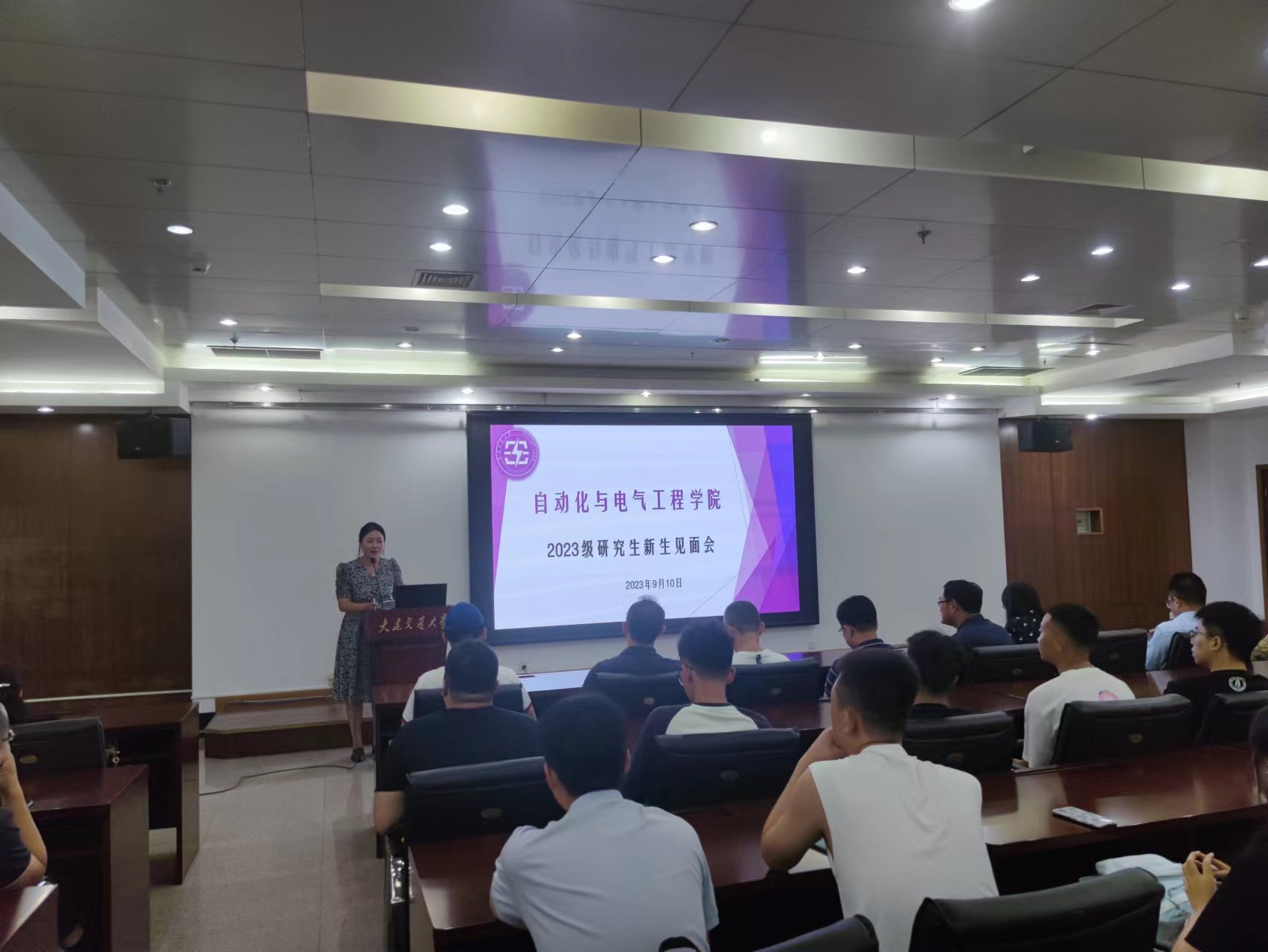 在沙河口校区图书馆多功能厅召开2023级研究生新生见面会暨专业教育会。学院领导班子、研究生导师、辅导员及2023级全体研究生参加会议。会议由党委副书记闻竹和学院副院长冯庆胜主持。