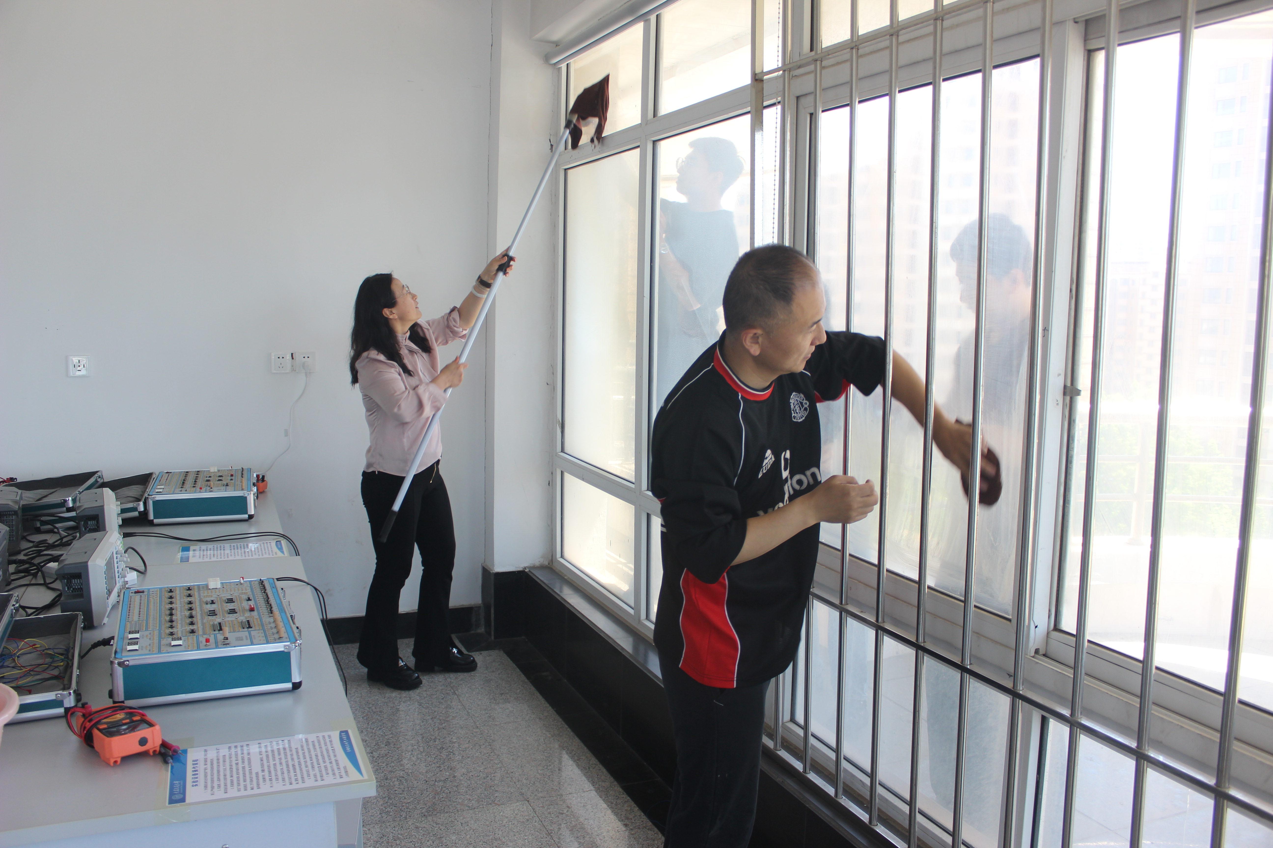 活动过程中,各系(中心)教职工、学生党支部党员分工明确,纷纷拿起滚刷、抹布等工具,对实验室进行认真清扫,尤其重点擦拭了实验室玻璃。大家热情高涨、密切合作,全身心地投入到劳动中,不怕脏、不怕苦、不怕累,从1楼到7楼,清洁打扫了单片机实验室、信号实验室、数电实验室等14间实验实训场所,全覆盖消灭实训楼卫生死角。经过大家共同努力,实验室面貌换热一新,地面、桌面干净整洁,试验设备摆放有序。在学院领导的带领下,大家以同劳动、共创造的方式,为学院高质量发展贡献力量。