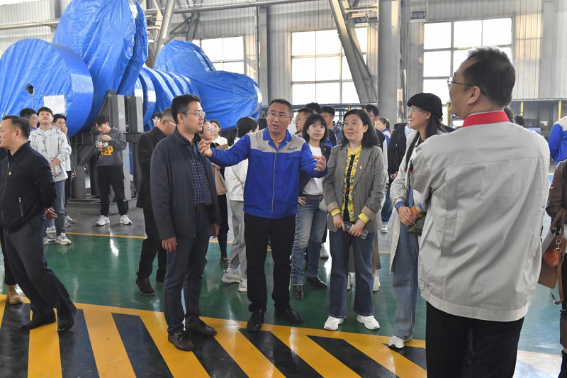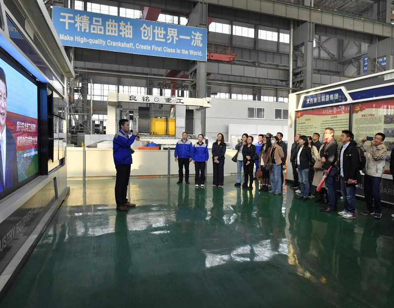 大连重工装备集团有限公司党群工作部部长马亚男等领导带领大家参观了曲轴车间和泉水基地,车间展示了船用曲轴的生产过程,世界最大500米口径球面射电望远镜馈源支撑索驱动系统,国内首台35万吨/年聚丙烯挤压造粒机组,世界最大费托合成反应器等一批大国重器。